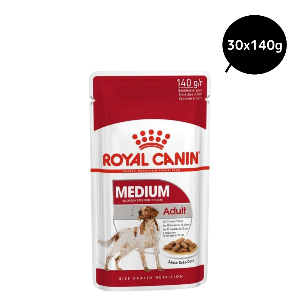 Suitable for dogs aged between 12 months and 10 years old that weigh between 11-25 kg, ROYAL CANIN® Medium Adult in Gravy is specially formulated with all the nutritional needs of your medium sized adult dog in mind. ROYAL CANIN® Medium Adult in Gravy supports optimal digestive health, as well as helping to maintain a healthy balance of intestinal flora.Thanks to a specific antioxidant complex and additional prebiotics, ROYAL CANIN® Medium Adult in Gravy helps to support and maintain your dog's natural defences.What's more, ROYAL CANIN® Medium Adult in Gravy is enriched with EPA and DHA – these Omega-3 fatty acids contribute to the maintenance of healthy skin and coat condition. To cater to each dog's individual preferences, ROYAL CANIN® Medium Adult is also available as dry food, with crunchy and tasty kibble. If you're considering mixed feeding, simply follow our feeding guidelines to ensure your dog gets an accurate amount of both wet and dry food for optimal benefit.